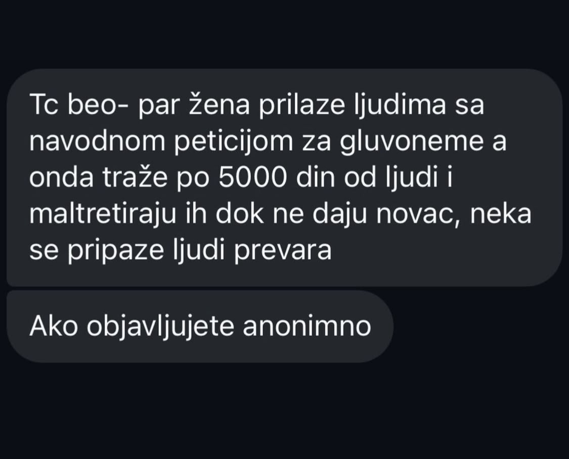Prema svedočenjima građana, juče je u tržnom centru Beo Shopping Center zabeležen slučaj u kojem je nekoliko žena prilazilo posetiocima sa navodnom peticijom za pomoć gluvonemima, nakon čega su od njih tražile novčane donacije.