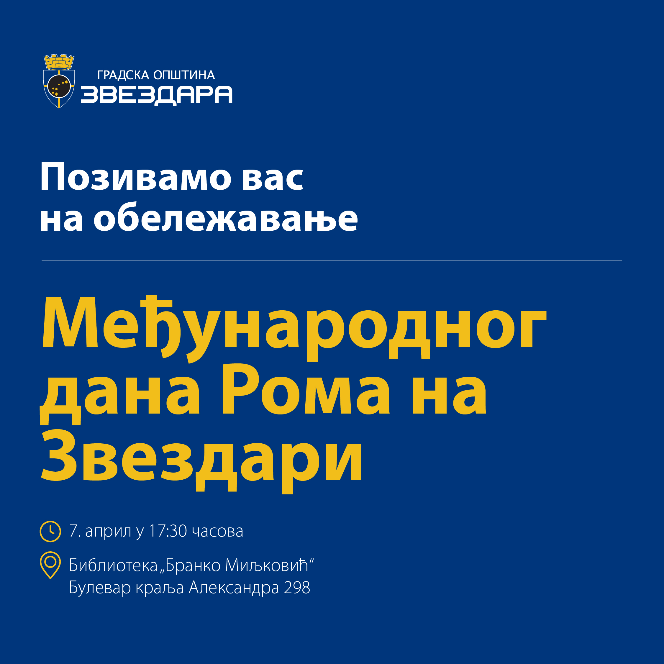 Međunarodni dan Roma (8. april) na Zvezdari biće obeležen u utorak, 7. aprila 2026. godine od 17.30 sati u Biblioteci „Branko Miljković“, Bulevar kralja Aleksandra 298. Manifestacija se održava u partnerstvu sa organizacijom „EHO“ iz Novog Sada.